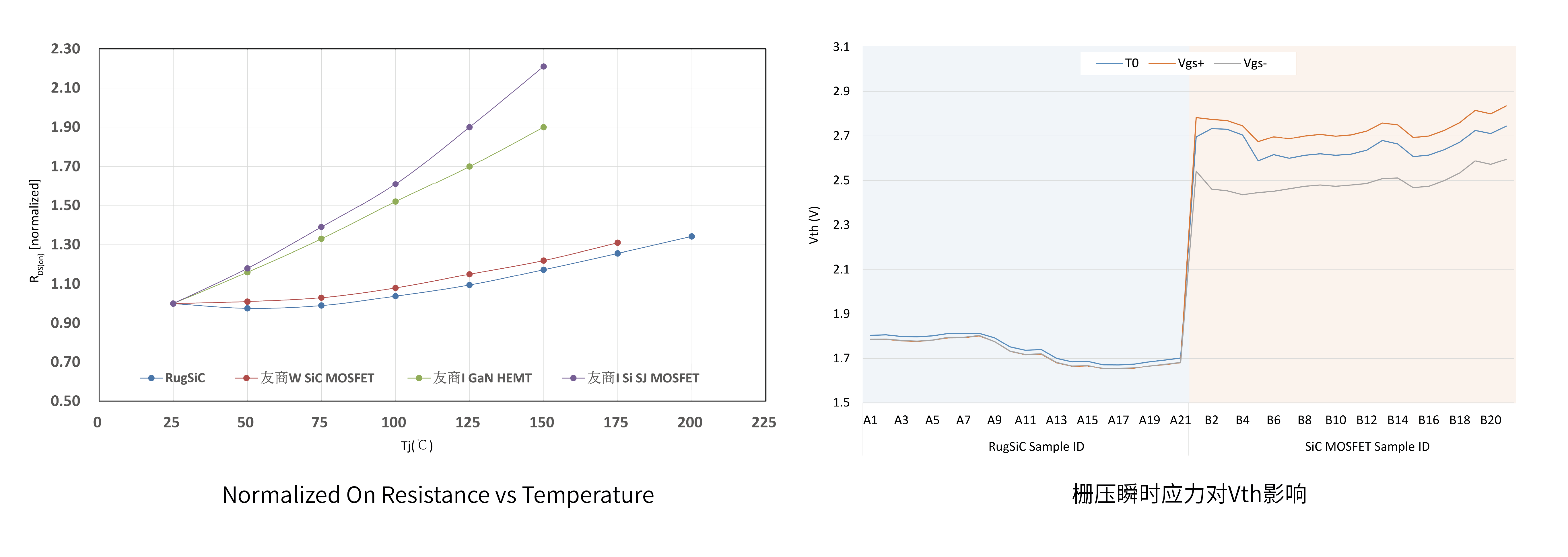 產(chǎn)品時(shí)域一致性高: 具備更佳溝道性能穩(wěn)定性, RugSiC不存在閾值漂移問(wèn)題,在高頻多管串并 聯(lián)應(yīng)用場(chǎng)合中產(chǎn)品開關(guān)同步性好,提高系統(tǒng)運(yùn)行安全系數(shù);